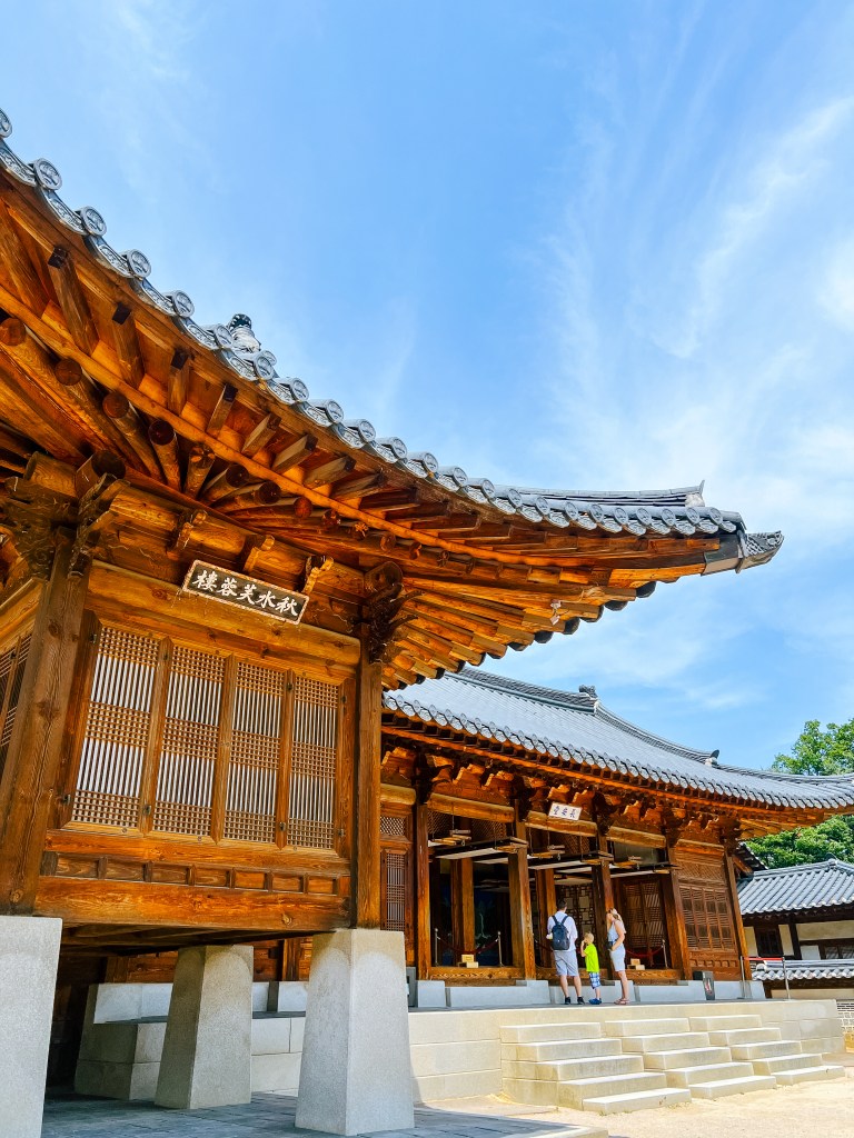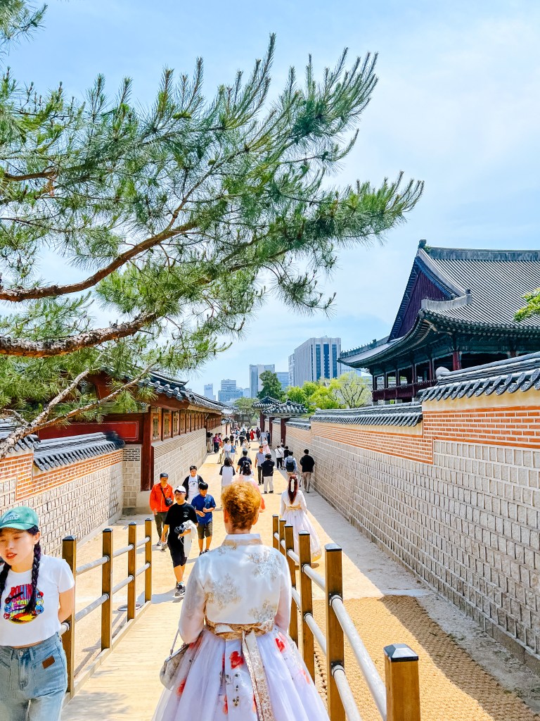 宮殿內,各國遊客絡繹不絕,無論男女幾乎都身著古代韓服,在宮殿裡的留影。