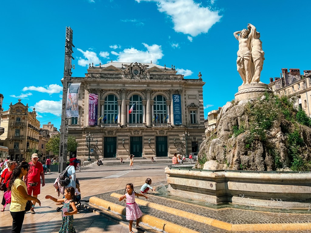 走到戲劇廣場(Place de la Comédie)時,廣場中央的噴水池閃著光,小朋友興奮地踩著水柱。幾位街頭藝人唱著聽不懂的法語歌,但旋律柔和,像陽光一樣自然地流進心裡。我們邊走邊聊,也邊靜下來聽這座城市的聲音。這裡的時間,彷彿真的慢了下來。